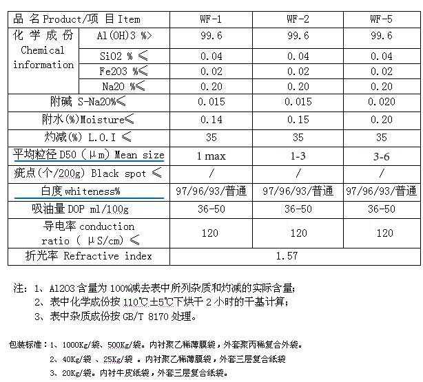 產(chǎn)品性能: 氫氧化鋁的起始分解溫度約205℃。氫氧化鋁阻燃劑受熱時能釋放出大量的水蒸汽,大量的水蒸汽能蓄熱和稀釋聚合物可燃?xì)怏w的濃度,還可以在燃源和基質(zhì)材料間形成不燃性屏障從而達(dá)到阻燃的目的。同時,它也是一種抑煙劑,因它釋放出的氣體是水蒸汽,對金屬無腐蝕。 氫氧化鋁(三水合氧化鋁)通過分解吸熱,生成水蒸汽及稀釋作用而發(fā)揮阻燃效能,為發(fā)揮更好的阻燃效果而加入更大量的阻燃劑時,使得材料物理—機(jī)械性能嚴(yán)重惡化,且引起材料加工上的諸多困難。為了緩解和解決這一問題,世界各國的相關(guān)廠家都提供具有各種粒徑和粒度分布而且經(jīng)過表面改性的氫氧化鋁,它們與高聚物相容性較佳,在基材中的分散性好,因而可允許更高的添加量,并有助于提高材料的伸長率、抗拉強(qiáng)度和抗沖強(qiáng)度。 產(chǎn)品標(biāo)準(zhǔn)及規(guī)格: